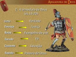 Efésios 6: 10. Concluindo, fortalecei-vos no Senhor e na força do seu poder! 11. Revesti-vos de toda a armadura de Deus, para poderdes ficar firmes contra as ciladas do Diabo; 12. Porquanto, nossa luta não é contra seres humanos, e sim contra principados e potestades, contra os dominadores deste sistema mundial em trevas, contra as forças espirituais do mal nas regiões celestiais. 13. Por esse motivo, vesti toda a armadura de Deus, a fim de que possais resistir firmemente no dia mau e, havendo batalhado até o final, permanecereis inabaláveis, sem retroceder. 14. Estai, portanto, firmes, trazendo em volta da cintura a verdade e vestindo a couraça da justiça, 15. calçando os vossos pés com a proteção do Evangelho da paz; 16. embraçando sempre o escudo da fé, com o qual podereis apagar todas as setas inflamadas do Maligno. 17. Usai igualmente o capacete da salvação e a espada do Espírito, que é a Palavra de Deus. 18. Orai no Espírito em todas as circunstâncias, com toda petição e humilde insistência. Tendo isso em mente, vigiai com toda a perseverança na oração por todos os santos. 19. Orai do mesmo modo por mim para que, quando eu falar, seja-me concedido o poder da mensagem, a fim de que, destemidamente, possa revelar o mistério do Evangelho, 20. pelo qual sou embaixador preso em correntes. Orai para que, permanecendo em Cristo, eu seja ousado para falar, como me cumpre fazê-lo.